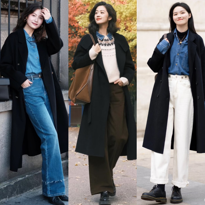 1.牛仔衬衫+黑大衣